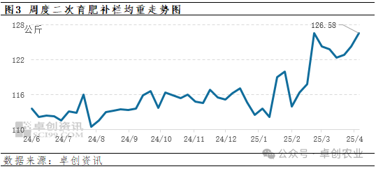 当前养殖端对120公斤以上或125公斤以上的二次育肥猪的补栏需求较高,二次育肥补栏体重震荡上涨,截止到4月11日,当周二次育肥补栏均重已涨至126.58公斤,为去年以来的最高水平,且已超越同期生猪交易均重水平。此现象一定程度上使得该体重段的生猪需求提升,对行情有支撑作用。