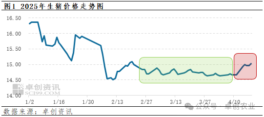 本周(4月14-18日)生猪市场行情打破近两个月的僵持局面,呈震荡上涨态势。根据卓创资讯监测,本周生猪市场行情最低点为14日的14.93元/公斤,最高价为18日的15.02元/公斤;周均价14.97元/公斤,环比上涨0.30元/公斤,涨幅2.07%。目前4月18日价格与4月初的低点14.63元/公斤相比,累计上涨0.39元/公斤,增幅2.67%。