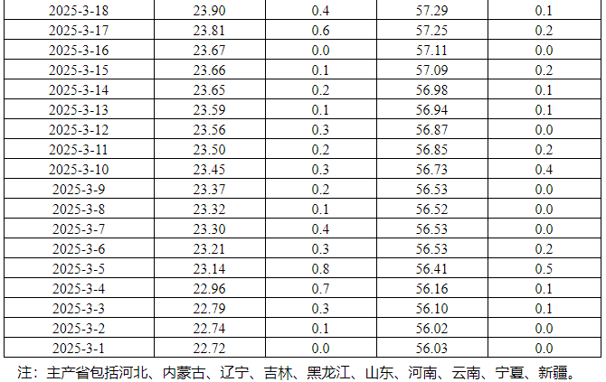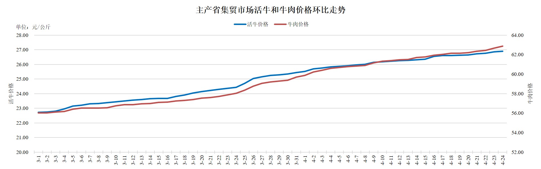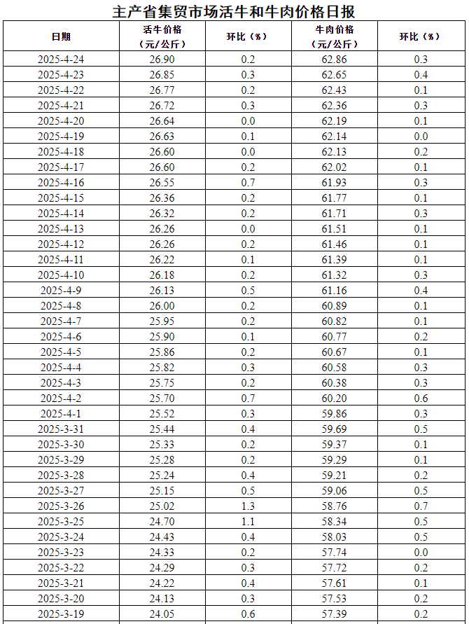 据农业农村部监测,2025年4月24日,主产省集贸市场活牛价格26.90元/公斤,同比上涨10.4%,环比上涨0.2%,自3月2日起连续上涨54天,累计上涨4.19元,涨幅18.4%;牛肉价格62.86元/公斤,同比下跌1.3%,环比上涨0.3%,自3月2日起震荡上行,累计上涨6.82元,涨幅12.2%。