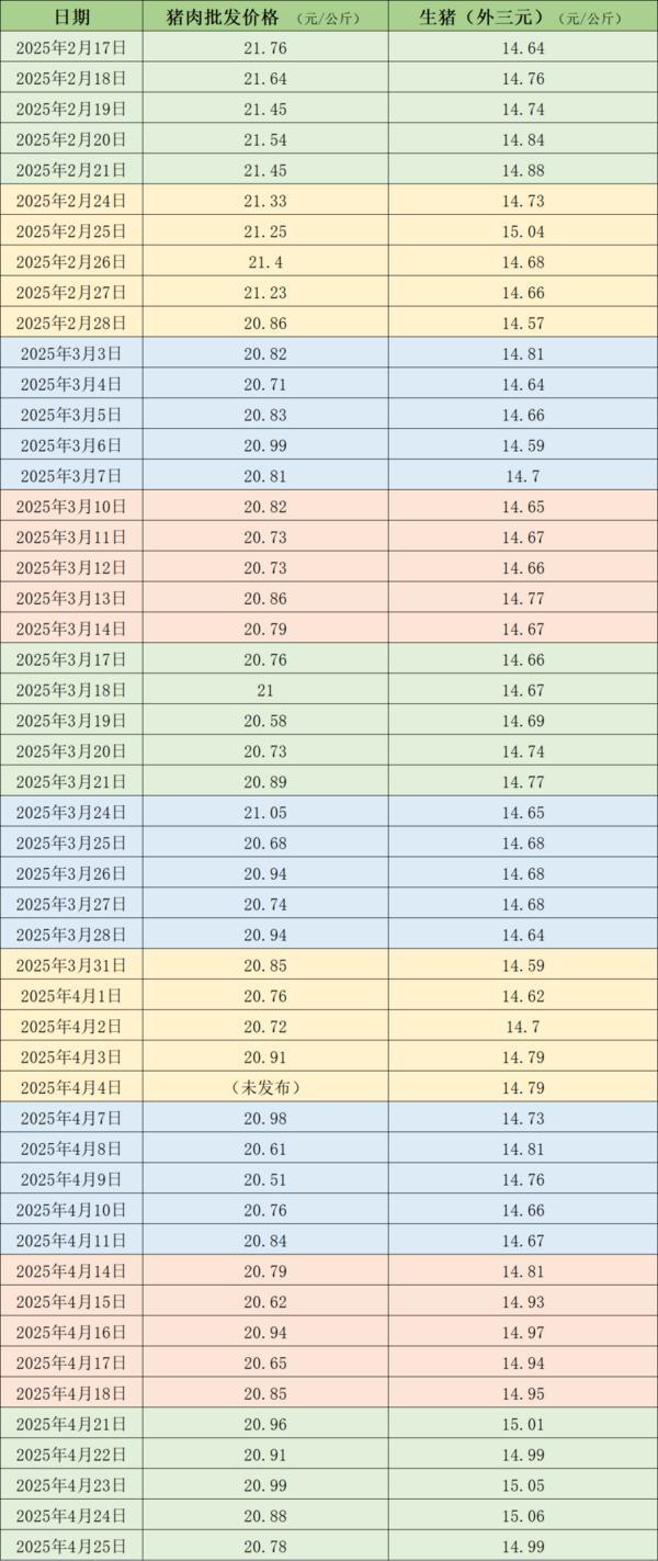 据农业农村部监测,4月25日,全国农产品批发市场猪肉平均价格为20.78元/公斤,与上周五(4月18日)的20.85元/公斤相比,下降0.3%。本周的平均价格为20.9元/公斤,与上周20.77元/公斤的均价相比,上涨0.6%。
