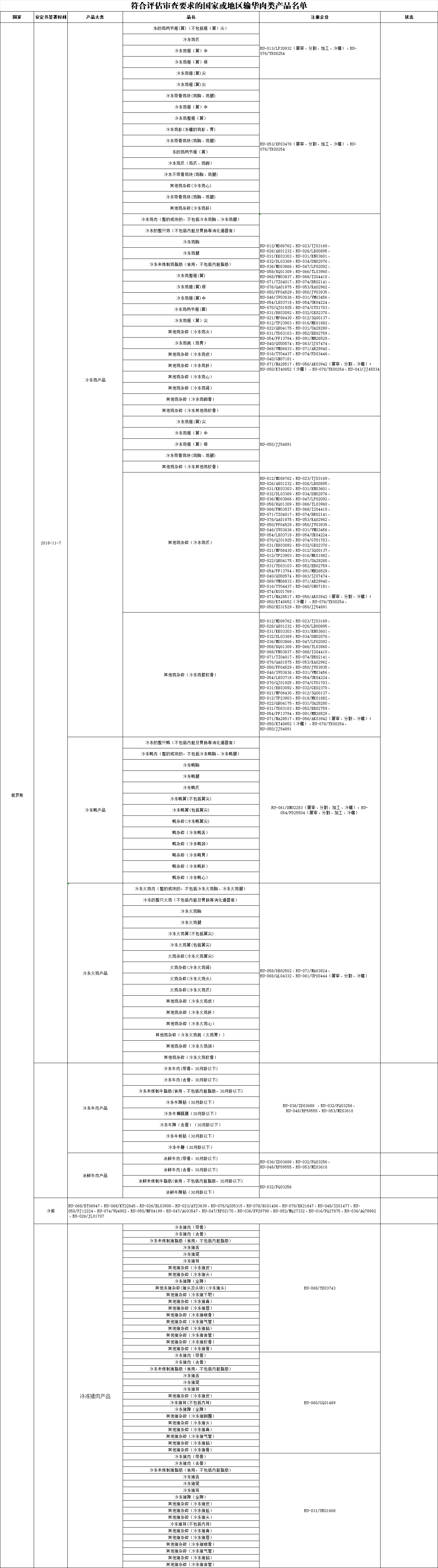 新增俄罗斯1家禽肉企业(注册编号为:RU-043/JJ45034)自2025年4月25日及之后生产/贮存的符合中国要求的肉类产品输华。