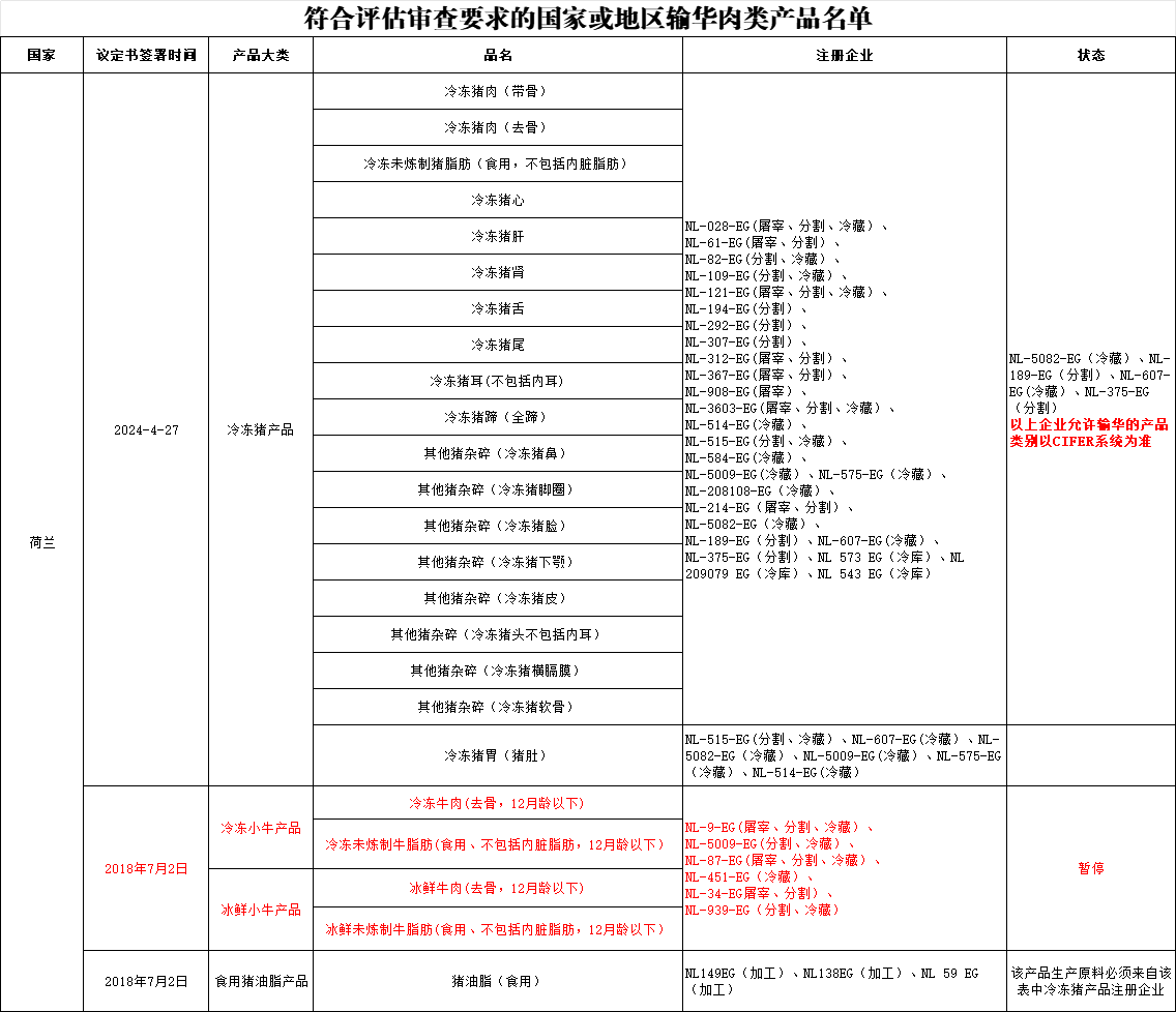 新增荷兰3家冷库(注册编号为:NL 573 EG、NL 209079 EG、NL 543 EG)自2025年4月25日及之后生产/贮存的符合中国要求的肉类产品输华。