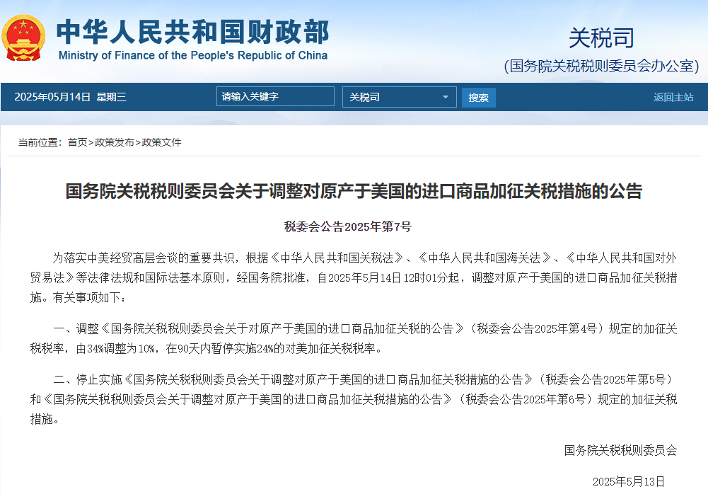 为落实中美经贸高层会谈的重要共识,根据《中华人民共和国关税法》、《中华人民共和国海关法》、《中华人民共和国对外贸易法》等法律法规和国际法基本原则,经国务院批准,自2025年5月14日12时01分起,调整对原产于美国的进口商品加征关税措施。有关事项如下: