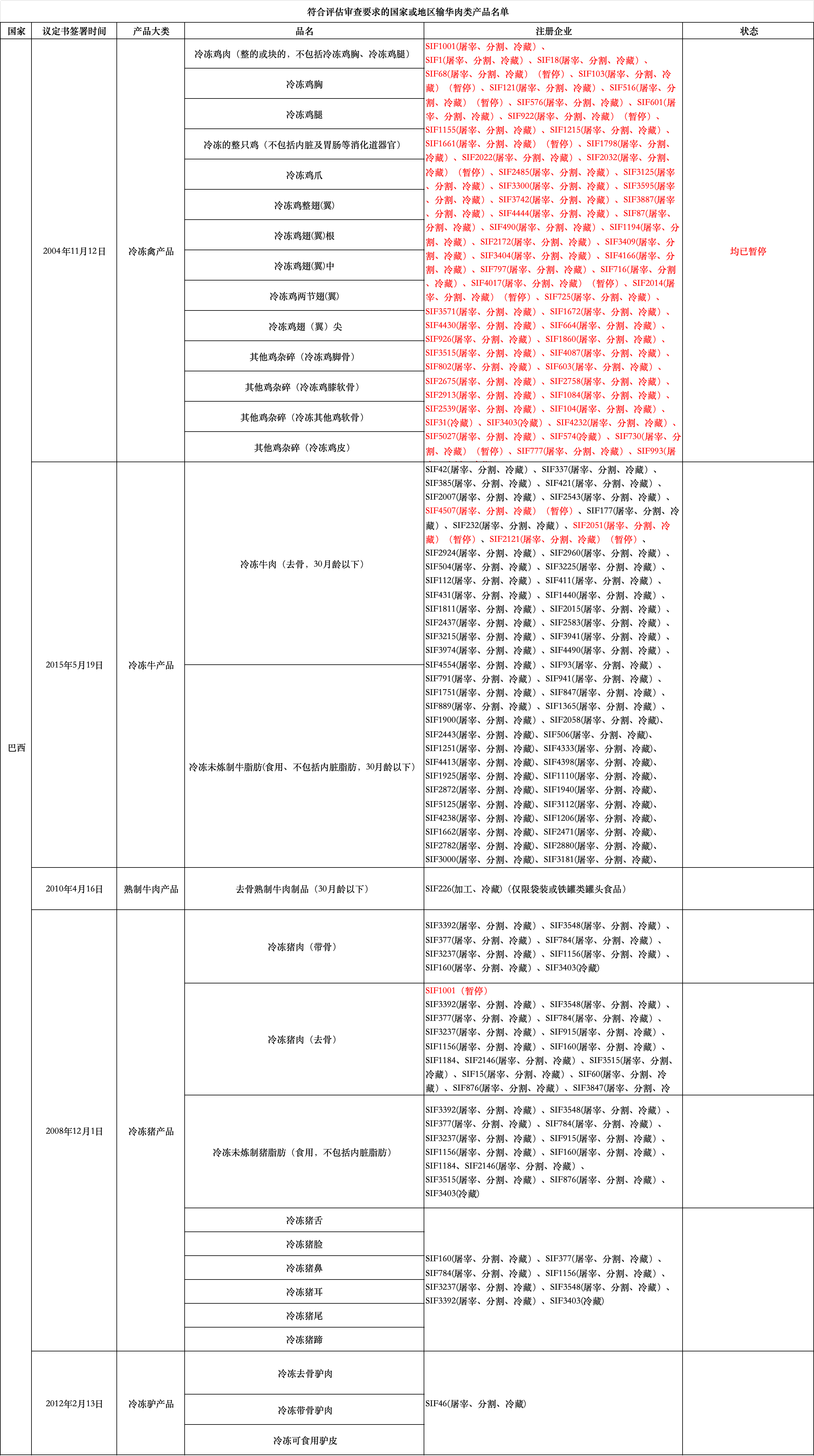 近日,海关总署更新《符合评估审查要求的国家或地区输华肉类产品名单》: