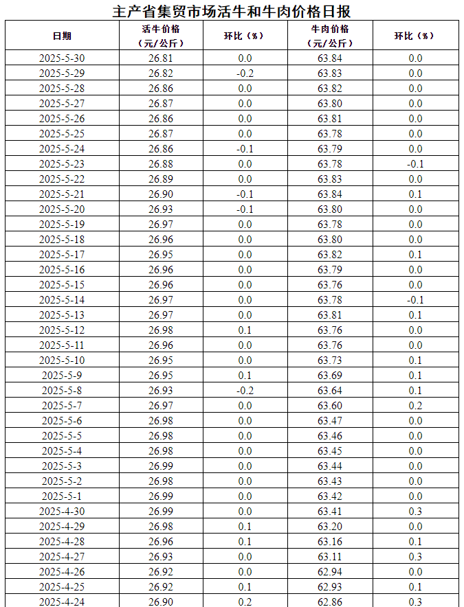据农业农村部监测,2025年5月30日,主产省集贸市场活牛价格每公斤26.81元,同比上涨15.4%,环比持平,其中辽宁活牛价格最高,每公斤27.86元,云南价格最低,每公斤25.75元。牛肉价格每公斤63.84元,同比上涨6.7%,环比持平,其中云南牛肉价格最高,每公斤73.52元,内蒙古价格最低,每公斤59.75元。