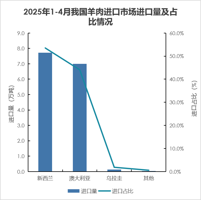 4.羊肉进口增加。1—4月,进口羊肉14.9万吨,同比增3.3%;进口额5.7亿美元,同比增23.7%。进口主要来自新西兰、澳大利亚和乌拉圭,分别占进口总量的51.9%、47.0%和0.9%,合计占99.8%,其中从新西兰和澳大利亚进口分别同比增3.4%和6.4%,从乌拉圭进口同比降52.7%。