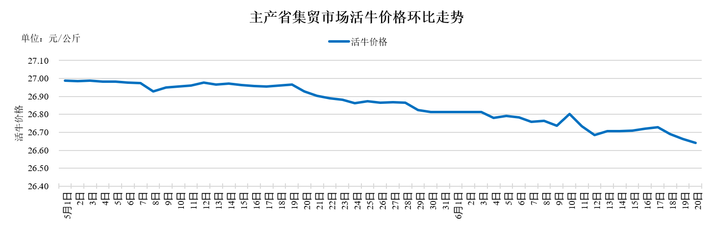 6月20日主产省集贸市场活牛价格环比下跌0.1%