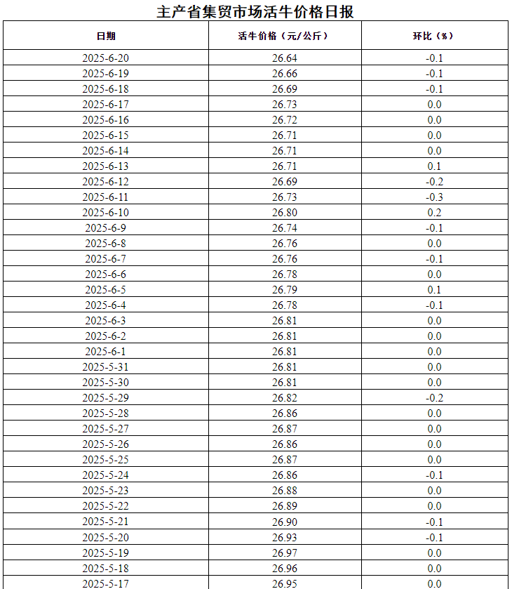 据农业农村部监测,2025年6月20日,主产省集贸市场活牛价格每公斤26.64元,同比上涨13.1%,环比下跌0.1%。