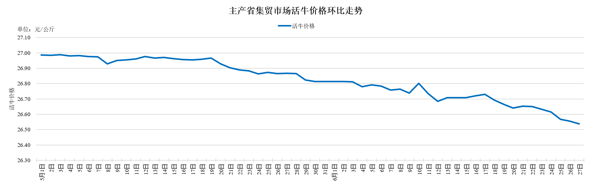 6月27日主产省集贸市场活牛价格环比下跌0.1%