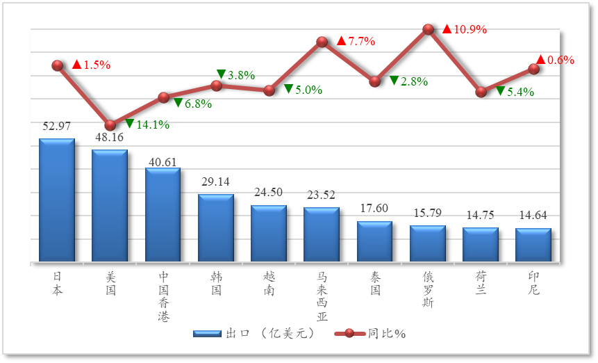 图4 我国农产品前10位出口市场出口额及同比
