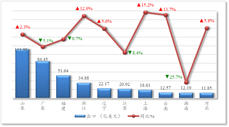 图5 我国农产品前10位出口省市出口额及同比