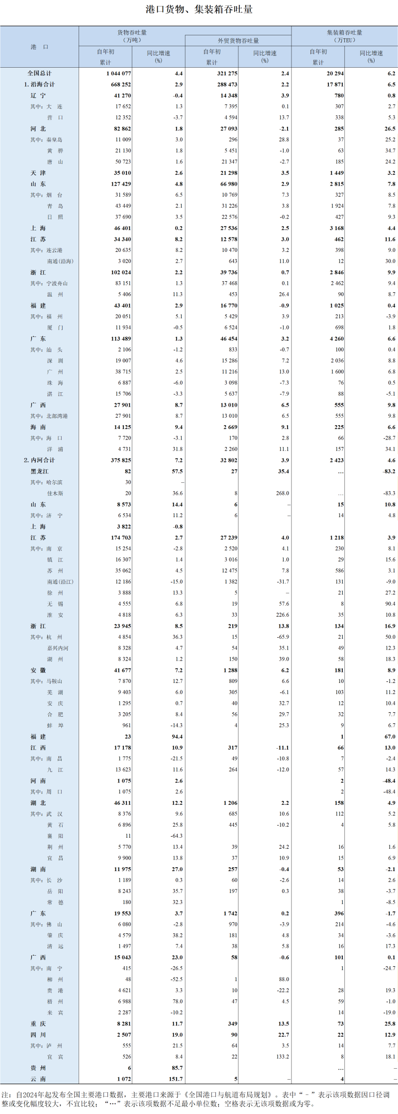 2025年1-7月港口货物、集装箱吞吐量