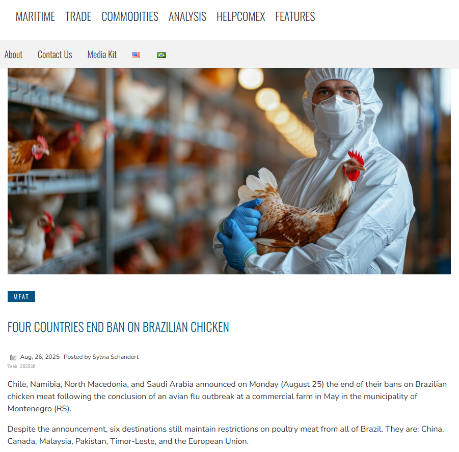 智利、纳米比亚、北马其顿和沙特阿拉伯周一(8 月 25 日)宣布,在 5 月份黑山市 (RS) 的一个商业农场爆发禽流感疫情后,结束对巴西鸡肉的禁令。
