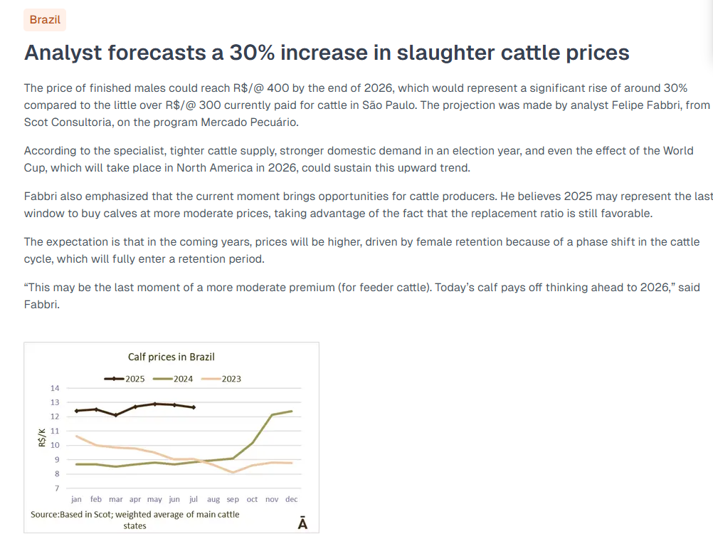 该预测由Scot Consultoria的分析师费利佩·法布里(Felipe Fabbri)在《畜牧市场》(Mercado Pecuário)节目中提出。