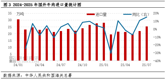 国外牛肉进口量也是反应国内实际牛肉供应量的重要数据指标。图2显示,2025年1-7月份,国内牛肉进口市场呈现下滑态势,牛肉进口量累计达155.2万吨,各月度进口量普遍低于2024年同期水平,较去年同期水平下滑7.53%。受国际粮价上涨及海外牧场成本增加影响,进口牛肉到港价优势减弱,目前国内外牛肉价差已收窄至5.00-8.00元/公斤,四季度进口量预计同比持平或略减,对国内牛肉市场的冲击减弱。