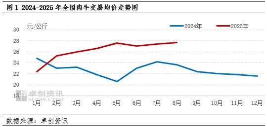 图1显示,进入2025年,肉牛价格呈现持续上行趋势。据卓创资讯数据监测,截至8月份,西门塔尔700公斤全国出栏月均交易价格为27.08元/公斤,环比上涨1.02%,较去年同期水平上涨17.29%。牛价开启上行通道,其主因是2023-2024年肉牛养殖户亏损导致肉牛产能出清,市场供需失衡显著,是导致牛价上涨的主要因素。