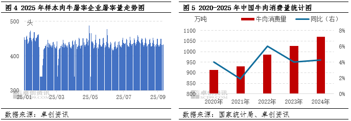 随着天气转冷及元旦、春节备货启动,四季度牛肉消费进入旺季。火锅、烧烤等餐饮消费增加,家庭消费亦同步回暖。四季度牛肉消费量或环比三季度有所提升。据国家统计局数据显示,2024年牛肉消费量1070万吨。较2023年增长4.29%,随着居民水平提升,牛肉需求或仍有增量空间。截至9月10日,卓创资讯监测肉牛样本屠宰量为0.44万头,环比上月同期水平上涨3.61%。四季度肉牛屠宰量或达到全年偏高水平,但考虑国内肉牛供应恢复缓慢,或进一步支撑肉牛及牛肉价格上行。