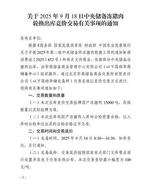 中新经纬9月16日电 华储网16日发布《关于2025年9月18日中央储备冻猪肉轮换出库竞价交易有关事项的通知》称,本次出库竞价交易挂牌国产冻猪肉15000吨,具体数量以实际挂牌为准。