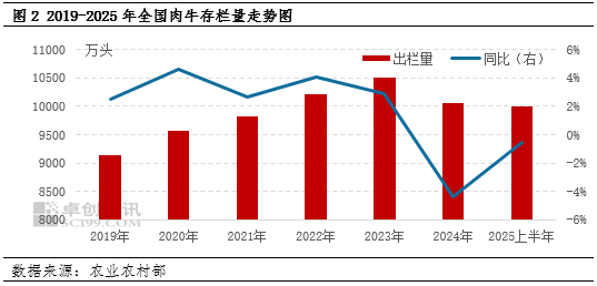图2显示,2025上半年肉牛总存栏量同比下降,直接反映了能繁母牛存栏下降传导至整个牛群总量的结果。据农业农村部数据监测,2025年上半年肉牛存栏量为9992万头,较去年同期水平下滑2.16%。