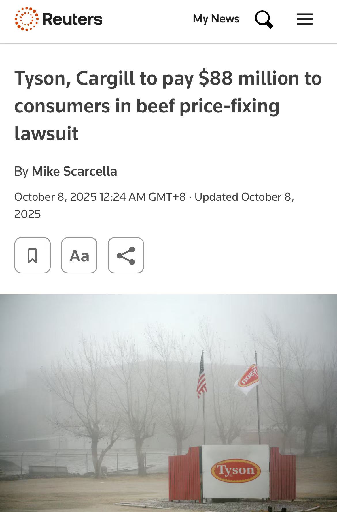 据路透社报道,泰森食品将支付5500万美元,嘉吉支付3250万美元,以了结消费者提起的集体诉讼。原告指控这两家公司通过限制供应、合谋抬高美国牛肉价格,损害消费者利益。