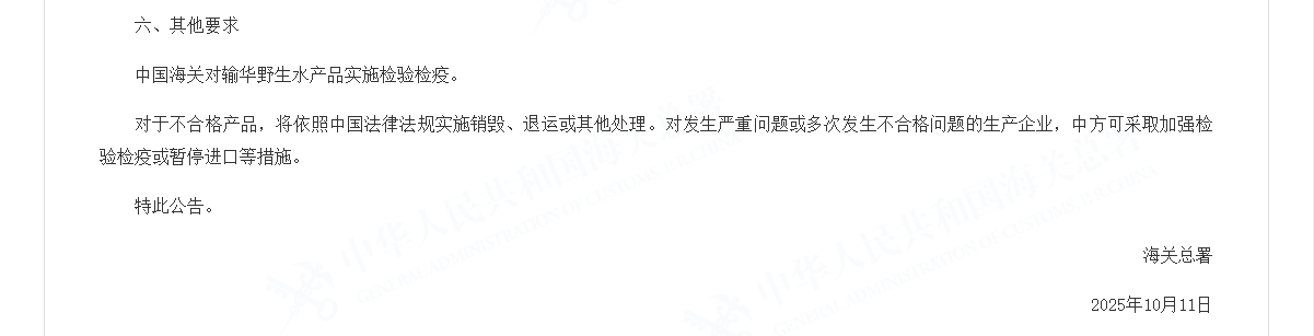 中国海关对输华野生水产品实施检验检疫。