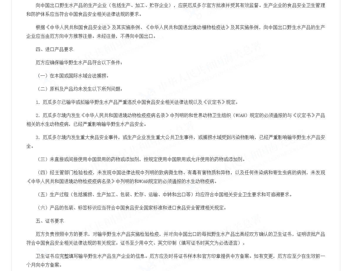 根据《中华人民共和国食品安全法》及其实施条例、《中华人民共和国进出境动植物检疫法》及其实施条例,向中国出口野生水产品的生产企业应当由厄方向中方推荐注册。未经注册,不得向中国出口。