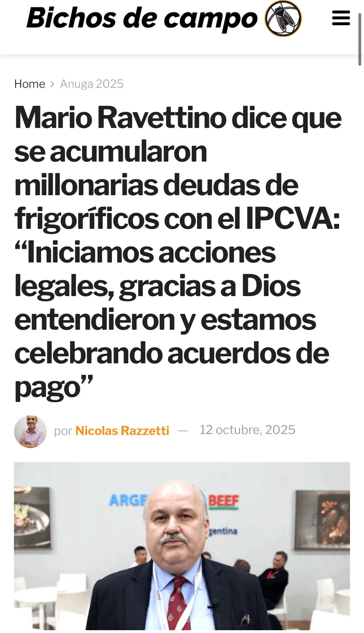 拉韦蒂诺在科隆Anuga食品展上接受《Bichos de Campo》采访时表示:"作为IPCVA的管理者,我们有法律义务采取行动,因为那些正常缴费的生产者和屠宰企业可能会质问:'为什么你们对不缴费的人什么也不做?'"