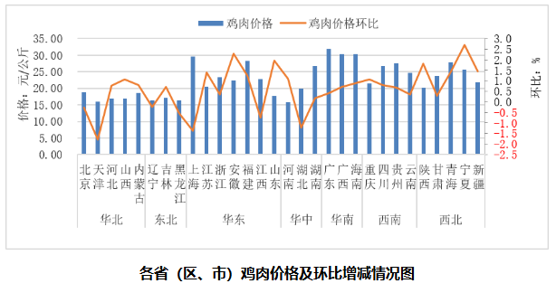 全国鸡肉平均价格22.55元/公斤,同比跌5.5%,环比涨0.6%。从涨跌情况看,宁夏、安徽、山东、陕西、新疆等23个省份价格上涨,天津、上海、湖北、江西、黑龙江等7个省份价格下跌。其中,西北地区环比涨幅较大,宁夏领涨,涨幅为2.7%。