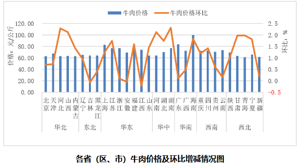 全国牛肉平均价格70.90元/公斤,同比涨3.9%,环比涨1.1%。河北、辽宁、吉林、山东和河南等主产省份牛肉平均价格为65.13元/公斤,同比涨14.6%,环比涨1.1%。从涨跌情况看,华中地区环比涨幅较大,湖南领涨,涨幅为2.3%。