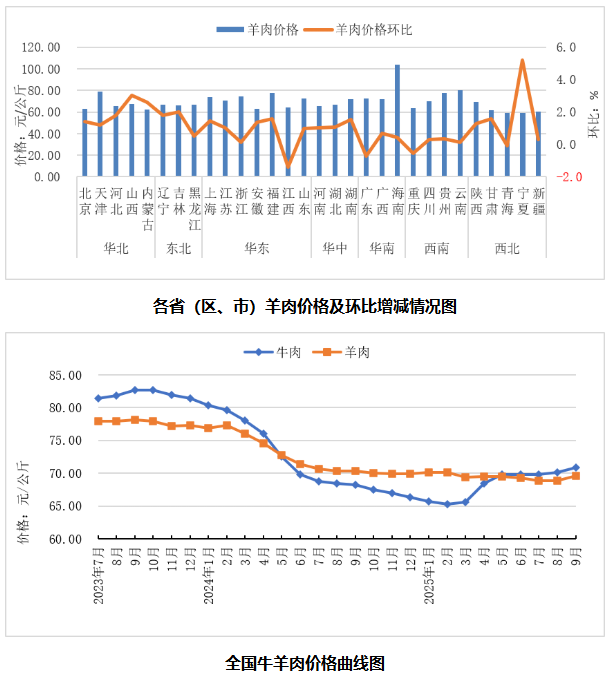 全国羊肉平均价格69.59元/公斤,同比跌1.0%,环比涨1.0%。河北、内蒙古、山东、河南和新疆等主产省份羊肉平均价格67.31元/公斤,同比跌4.3%,环比涨1.1%。从涨跌情况看,华北地区环比涨幅较大,山西领涨,涨幅为3.0%。