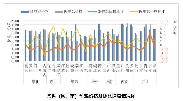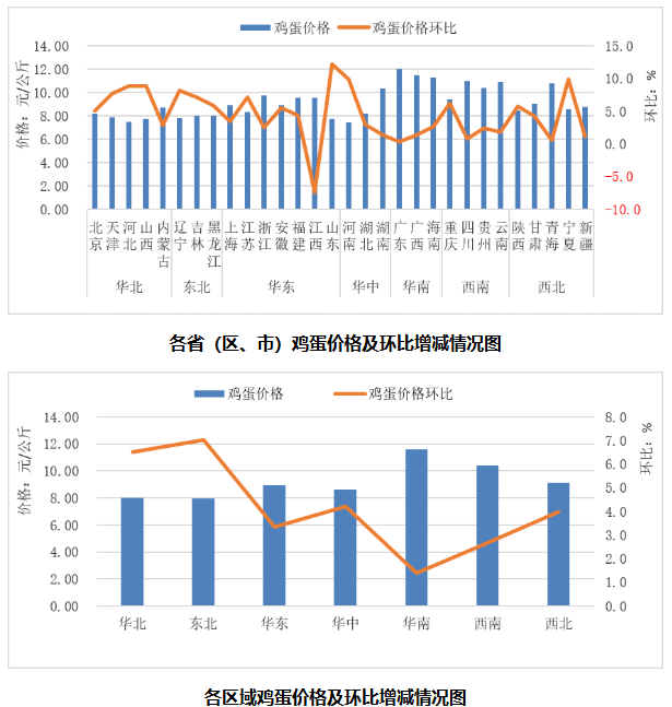 全国鸡蛋平均价格9.15元/公斤,同比跌21.6%,环比涨3.9%。河北、辽宁等10个主产省份鸡蛋平均价格7.99元/公斤,同比跌28.1%,环比涨7.8%。从涨跌情况看,山东、河南、宁夏、山西、河北等29个省份价格上涨,江西价格下跌。其中,东北地区环比涨幅较大,辽宁领涨,涨幅为8.2%;从价格水平来看,华南地区鸡蛋平均价格最高,为11.59元/公斤;东北地区最低,为7.94元/公斤。