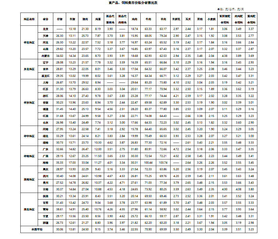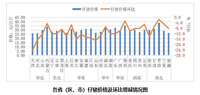 全国仔猪平均价格30.06元/公斤,同比跌27.5%,环比跌10.6%。从涨跌情况看,全国29个监测省份价格均下跌。其中,华北地区环比跌幅较大,天津领跌,跌幅为24.3%。从价格水平来看,华南地区仔猪平均价格最高,为32.38元/公斤;东北地区最低,为28.75元/公斤。