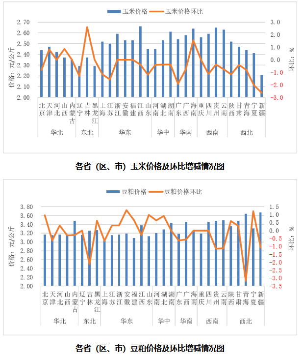 全国玉米平均价格2.49元/公斤,同比跌0.4%,环比跌0.4%,主产区东北三省玉米平均价格2.32元/公斤,环比涨0.4%。主销省广东玉米平均价格为2.54元/公斤,环比跌1.9%。全国豆粕平均价格3.30元/公斤,同比跌2.9%,环比持平。