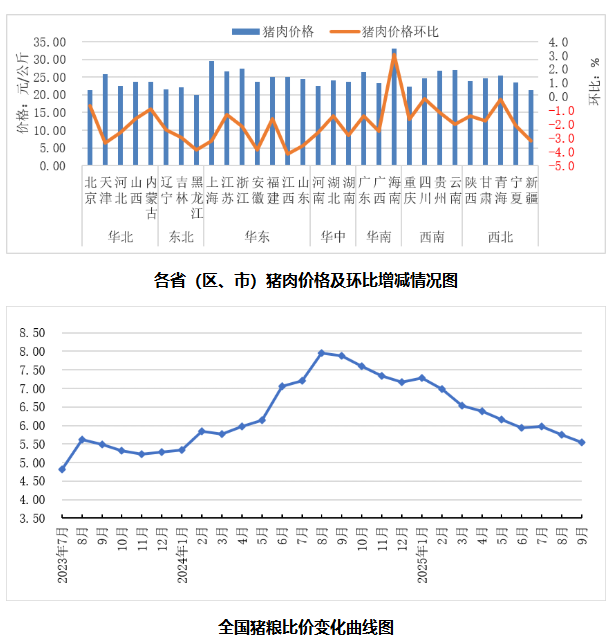 据对全国500个县集贸市场和采集点的监测,2025年9月份,鸡蛋、商品代肉雏鸡、鸡肉、肉牛、肉羊、生鲜乳价格环比上涨,生猪产品、商品代蛋雏鸡、玉米价格环比下降,豆粕、配合饲料价格环比持平。按集贸市场监测口径,本月猪粮比价为5.55:1,比上月下跌0.19个点。