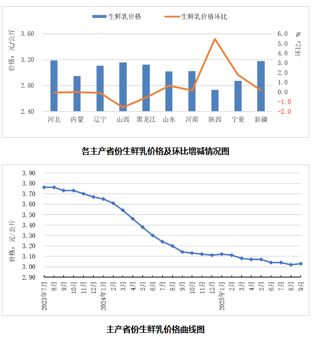 内蒙古、黑龙江等10个主产省份生鲜乳平均价格3.03元/公斤,同比跌3.5%,环比涨0.3%。