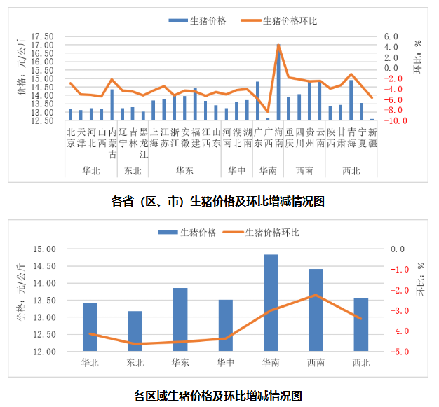 全国生猪平均价格13.81元/公斤,同比跌29.9%,环比跌3.8%。从涨跌情况看,海南价格上涨,广西、广东、新疆、山西、江西等29个省份价格下跌。其中,东北地区环比跌幅较大,黑龙江领跌,跌幅为5.2%。从价格水平来看,华南地区生猪平均价格最高,为14.84元/公斤;东北地区最低,为13.18元/公斤。