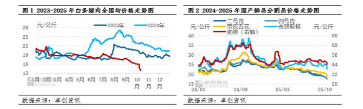 2025年中秋、国庆双节过后,国内鲜品猪肉价格持续下探,不断创年内新低,至月中旬价格已跌至近7年来的历史最低点。伴随着鲜冻价差收窄直至“倒挂”,国产及进口冻品分割品价格亦跟随下降,其中进口猪肉市场成交寡淡,部分市场处于有价无市的状态。后期来看,预计10月下半月猪肉价格反弹难度较大,11-12月份或先涨后降。