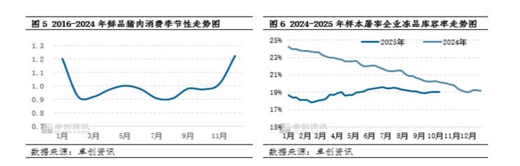 长期来看,预计11-12月份国产鲜品猪肉价格或先涨后跌,冻品价格继续缓跌。根据生猪的生长周期推算,2025年四季度国内适重猪源充裕;同时从图5看到,11-12月份鲜猪肉需求亦有明显提升。供需双增,其中11月份因市场大猪供应偏少,部分养殖端或存压栏增重的意向,一定程度上缓解供应过剩的状态,国内鲜品猪肉价格或低位小涨;但幅度十分有限,涨幅或在5%以内。12月份供应压力凸显,鲜品猪肉价格或再度回落,幅度或在3%以内。因鲜品猪肉价格较低,对冻品销售产生冲击,屠宰企业及进口商或降价走量,11-12月份冻猪肉价格或缓跌为主;因其企业及港口冻品库存压力不大,预计价格累计跌幅或在5%-10%。