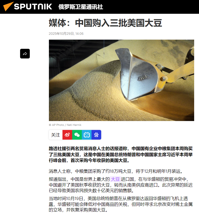 据俄罗斯卫星通讯社报道,中国中粮集团近期购入三批美国大豆,总计约18万吨,计划于今年12月和明年1月装运。虽然截至目前,这一消息尚未获得中国官方确认,但已在境外网络广泛流传,仍需等待权威证实。