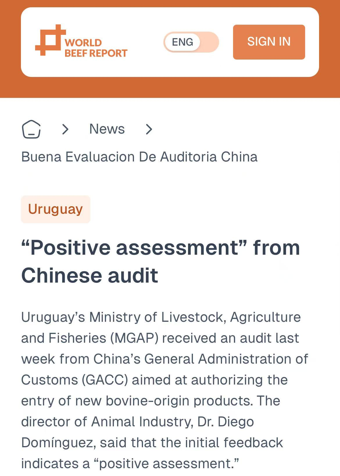 审计期间,中方代表团实地走访了多家屠宰厂和牛血清加工厂,全面考察了产品生产与监管流程。多明格斯表示,审计过程顺利,乌拉圭卫生体系的可靠性再次得到验证。近年来,乌拉圭陆续实现了多种高管控产品对华出口,进一步体现了中国对其监管体系的信任。
