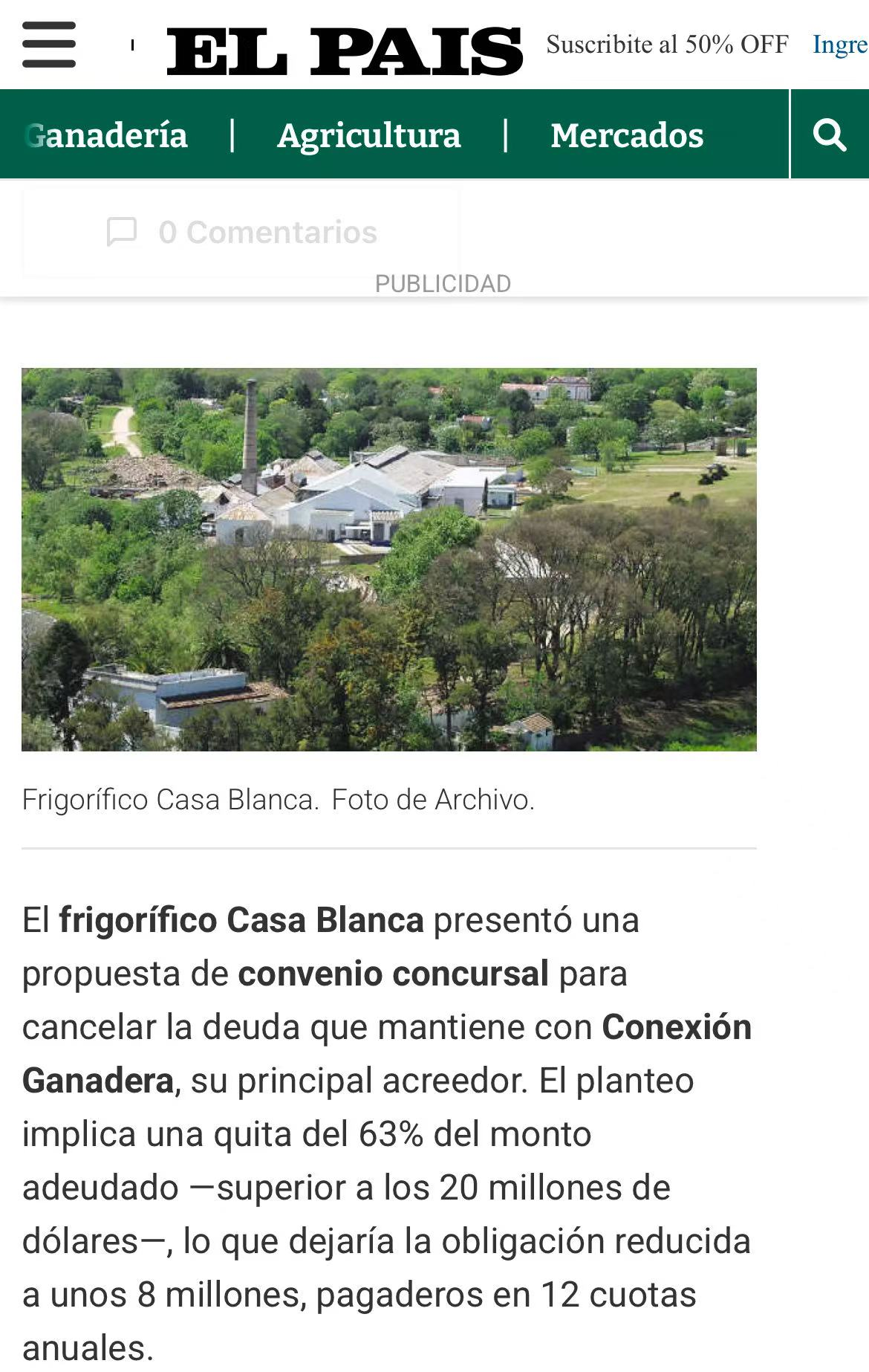 乌拉圭知名牛肉屠宰加工企业Casa Blanca(注册厂号58)近日与其主要债权人达成一项关键债务重整协议,成功避免破产清算。根据协议,该厂所欠逾2000万美元债务将被削减63%,降至约800万美元,并分12年偿还。