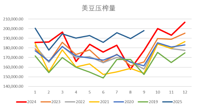 从压榨的情况来看,美国全国油籽加工商协会(NOPA)发布的月度压榨数据显示,9月份大豆压榨量大幅增长,创下有记录以来的第四个月度高点,也是历史同期最高纪录,因为在秋季新豆收获季来临之前,美国大豆加工业已从季节性的设备维护停产中恢复,生产步伐显著加快。NOPA报告显示,会员企业在2025年9月份的大豆压榨量为1.97863亿蒲(相当于593.6万短吨),较8月份的1.8981亿蒲增长4.24%,较2024年9月份的1.7732亿蒲增长11.59%。
