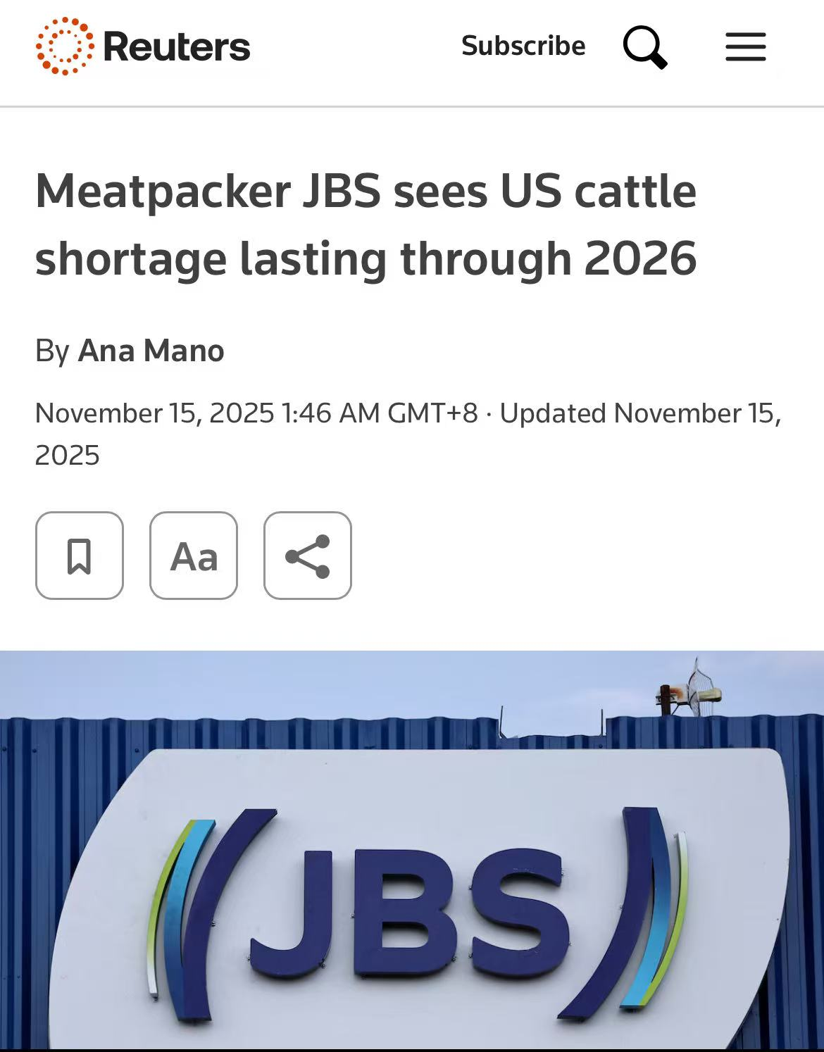 捷嘉 ·关注 | JBS预警美国牛肉供应持续紧张,行业复苏需待2027年后