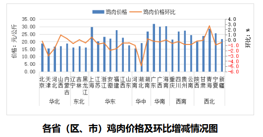 全国鸡肉平均价格22.43元/公斤,同比跌5.3%,环比跌0.5%。从涨跌情况看,青海、山西、上海、内蒙古、湖南等6个省份价格上涨,湖北、天津、安徽、福建、河北等22个省份价格下跌,海南、甘肃2个省份价格持平。其中,西北地区环比涨幅较大,青海领涨,涨幅为2.7%;华中地区环比跌幅较大,湖北领跌,跌幅为4.9%。