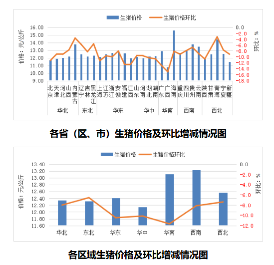 全国生猪平均价格12.57元/公斤,同比跌31.1%,环比跌9.0%。从涨跌情况看,全国30个监测省份价格均下跌。其中,华南地区环比跌幅较大,广西领跌,跌幅为15.0%。从价格水平来看,西南地区生猪平均价格最高,为13.24元/公斤;华中地区最低,为12.15元/公斤。
