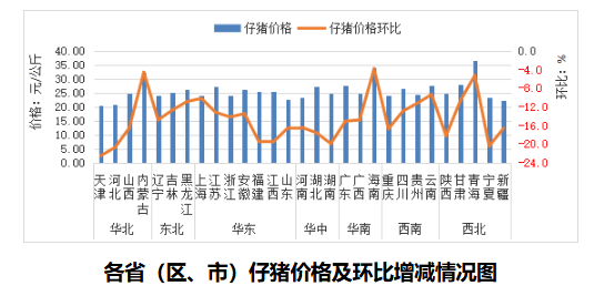 全国仔猪平均价格25.80元/公斤,同比跌29.1%,环比跌14.2%。从涨跌情况看,全国29个监测省份价格均下跌。其中,华中地区环比跌幅较大,湖南领跌,跌幅为19.9%。从价格水平来看,华南地区仔猪平均价格最高,为28.85元/公斤;华北地区最低,为24.65元/公斤。