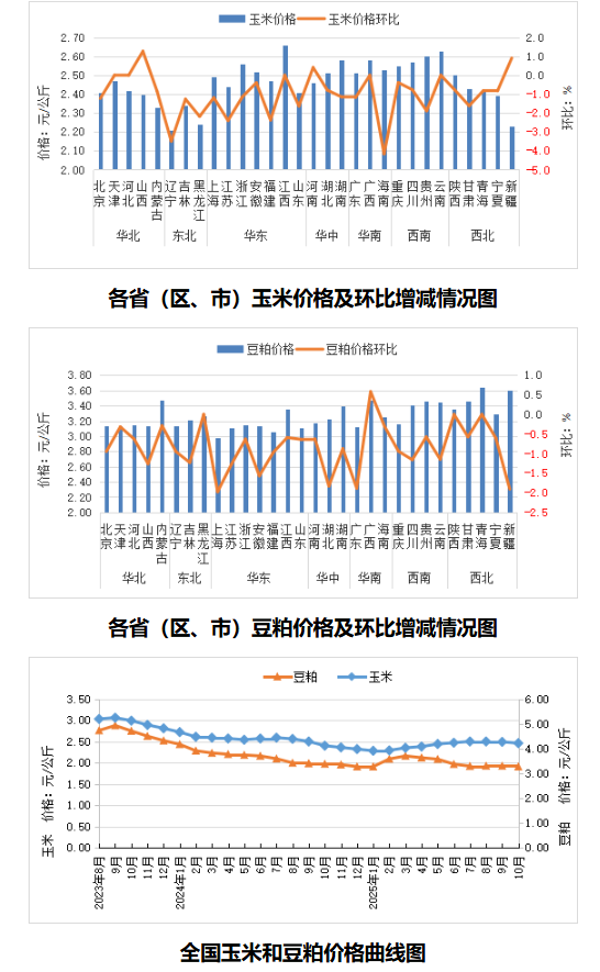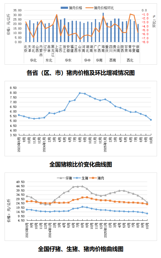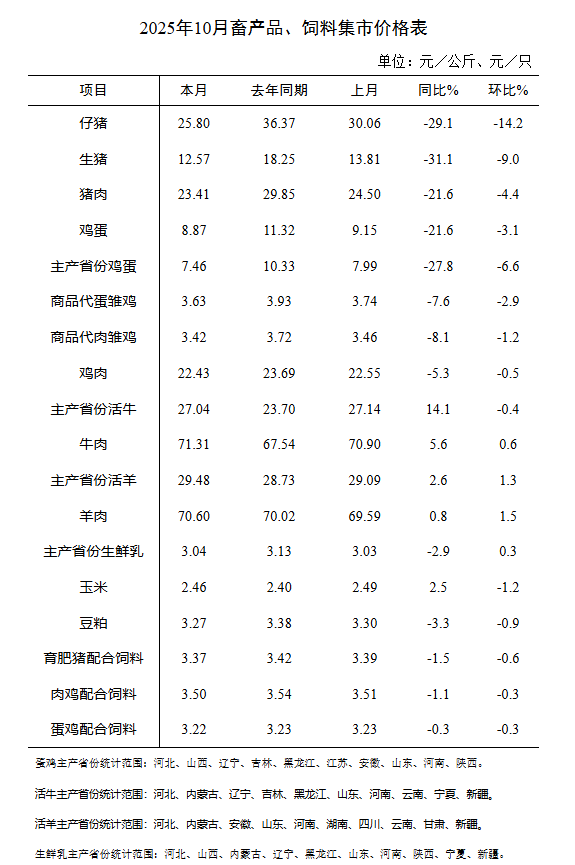 据对全国500个县集贸市场和采集点的监测,2025年10月份,牛肉、肉羊、生鲜乳价格环比上涨,生猪产品、鸡蛋、商品代雏鸡、鸡肉、活牛、饲料产品价格环比下降。按集贸市场监测口径,本月猪粮比价为5.11:1,比上月下跌0.44个点。