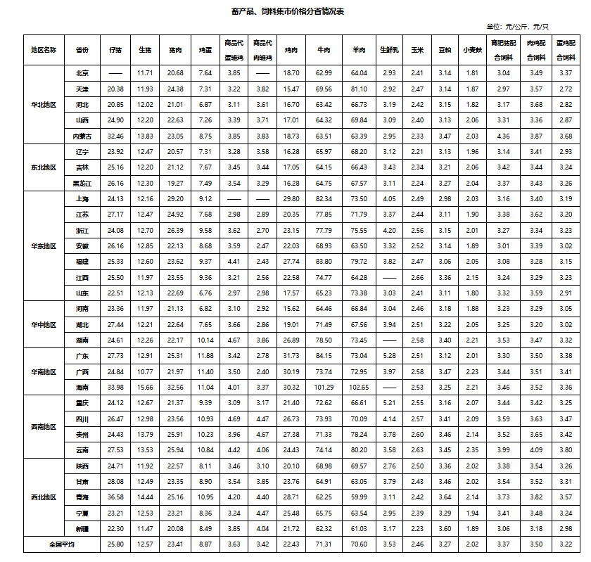 全国育肥猪配合饲料平均价格3.37元/公斤,同比跌1.5%,环比跌0.6%。肉鸡配合饲料平均价格3.50元/公斤,同比跌1.1%,环比跌0.3%。蛋鸡配合饲料平均价格3.22元/公斤,同比跌0.3%,环比跌0.3%。