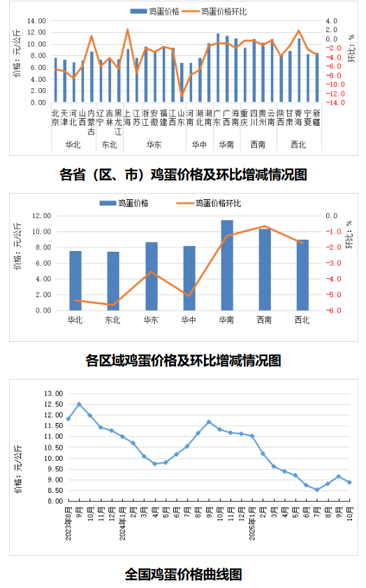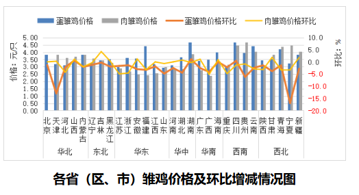 全国鸡蛋平均价格8.87元/公斤,同比跌21.6%,环比跌3.1%。河北、辽宁等10个主产省份鸡蛋平均价格7.46元/公斤,同比跌27.8%,环比跌6.6%。从涨跌情况看,上海、青海、内蒙古3个省份价格上涨,山东、河北、河南、江苏、天津等27个省份价格下跌。其中,东北地区环比跌幅较大,黑龙江领跌,跌幅为6.6%。从价格水平来看,华南地区鸡蛋平均价格最高,为11.44元/公斤;东北地区最低,为7.49元/公斤。