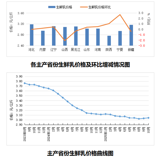 内蒙古、黑龙江等10个主产省份生鲜乳平均价格3.04元/公斤,同比跌2.9%,环比涨0.3%。